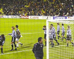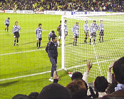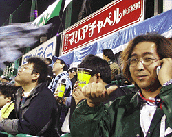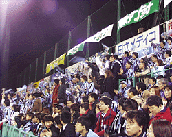 | そして試合は柏優勢。フロンタも必死で守ったのですが、前半ロスタイムに入れられ そのまま1−0で敗れてしまい、降格が決定となりました。それでも、サポは暖かい拍手。 落ち込むサポの姿を撮りにきたカメラに対し「J1最後なんだから笑顔で!!」 ということで笑顔を向けたそうです。 |