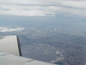 福岡空港離発着の飛行機がすぐ近くを飛んでいきます